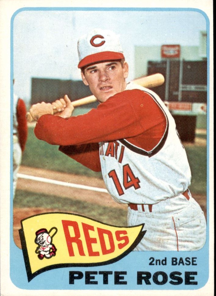 I love this 1965 Topps card of Pete Rose. It’s a great photo of him with the Reds and his number is visible on the front of the uniform. I really like the design of 1965 Topps, especially the banner at the bottom with the team’s name and logo displayed. Love that old school Reds logo!