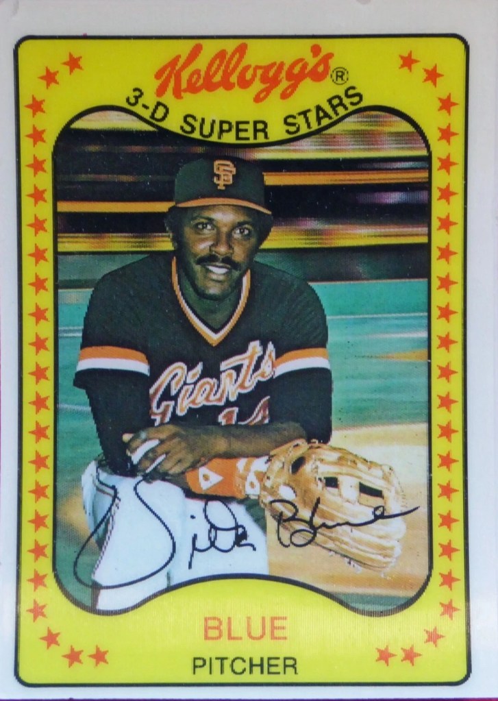 I really wanted to pick a card with Vida Blue on the Oakland A’s, but the only cards I could find that had the number visible showed uniform number 35. Then I saw this beauty. I love Kellogg’s Brand 3-D baseball cards. This is from 1981 and you can see Blue’s number 14 right on the front of his Giants uniform.